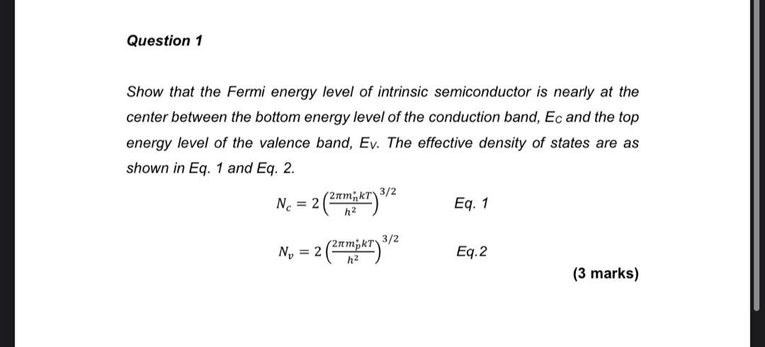 The fermi energy level of a semiconductor, denoted \(e_f\), represents the energy level at which the probability of finding an electron is one half 9 [10, p. Therefore, the fermi level for the extrinsic semiconductor lies close to the conduction or valence. Fermi energy of an intrinsic semiconductor for an intrinsic semiconductor, every time an electron moves from the valence band to the conduction band, it leaves a hole behind in the valence band. The occupancy of semiconductor energy levels. Fermi level of intrinsic semiconductor fermi level of intrinsic semiconductor those semi conductors in which impurities are not present are known as intrinsic semiconductors. (18) is of the order of 1 ev, while the second is of the order of a few tens of millielectron volts at 300 k. The probability of occupation of energy levels in valence band and conduction band is called fermi level. Show that for intrinsic semiconductors the fermi level lies midway between the conduction band and the valence band. It is sometimes called the fermi level or the chemical potential. Fermi level in the middle of forbidden band indicates equal concentration of free electrons and holes. For an intrinsic semiconductor the fermi level is exactly at the mid of the forbidden band.energy band gap for silicon (ga) is. Thus, the average energy level of electrons and holes is half of the energy band gap in intrinsic semiconductors. Fermi energy level (a) is the top most filled energy level at 0k temperature (b) is the top most filled energy level at 00c temperature.